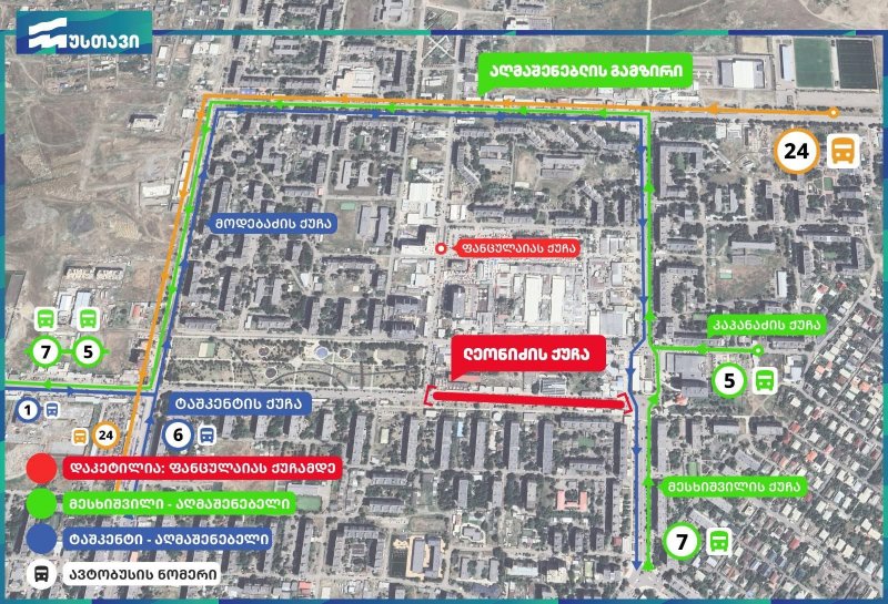 რუსთავში ლეონიძის ქუჩაზე დაგეგმილი სარეაბილიტაციო სამუშაოების გამო N1, N5, N6, N7, N10ა და N24 მუნიციპალური ავტობუსების მოძრაობის მარშრუტი იცვლება.