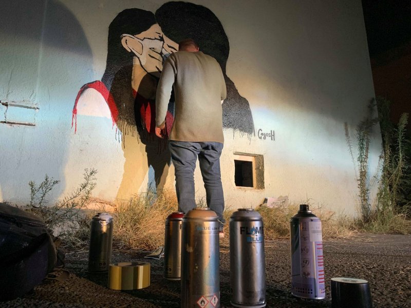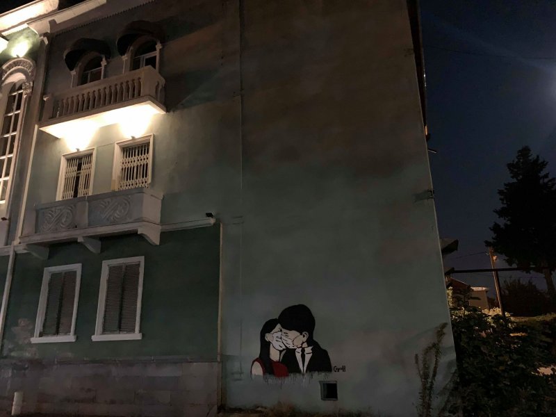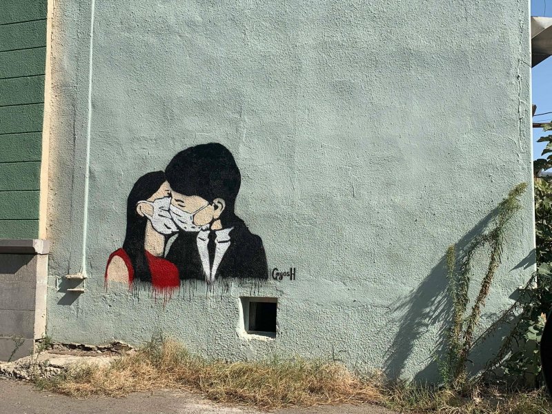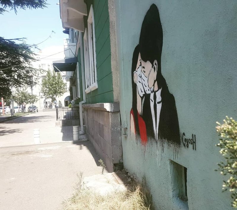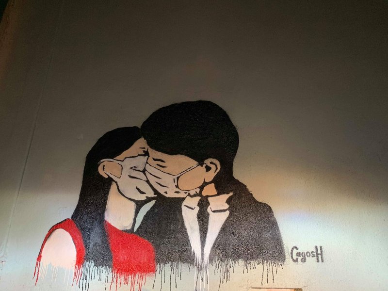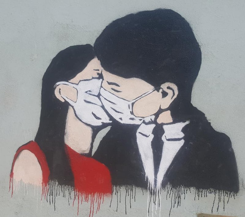 ერთი შეხედვით უწყინარი ნახატი გვამცნობს რომ ქალაქში სუნთქვა ჭირს და სწორედ ამიტომ წყვილი ერთმანეთს პირბადით კოცნის.