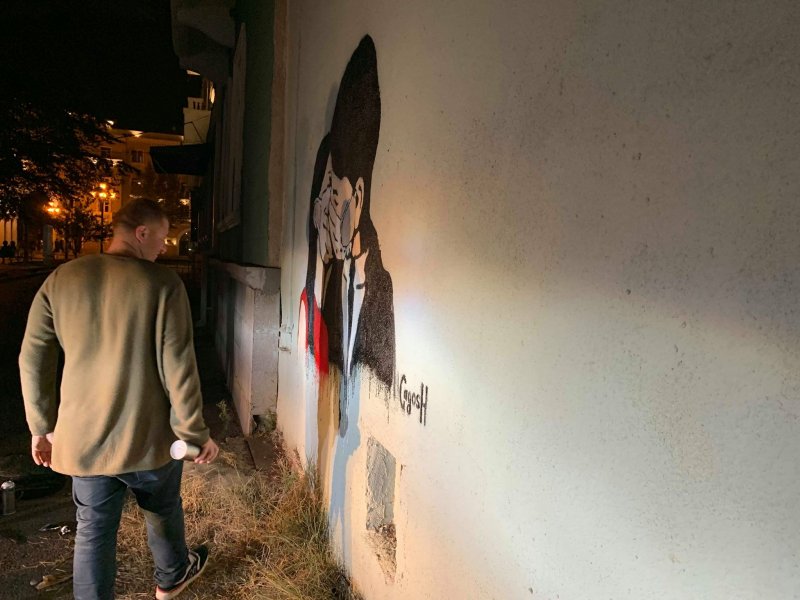 რუსთავში, კოსტავას გამზირზე, ერთერთი საცხოვრებელი კორპუსის ფასადზე პირბადიანი წყვილი "გამოისახა".