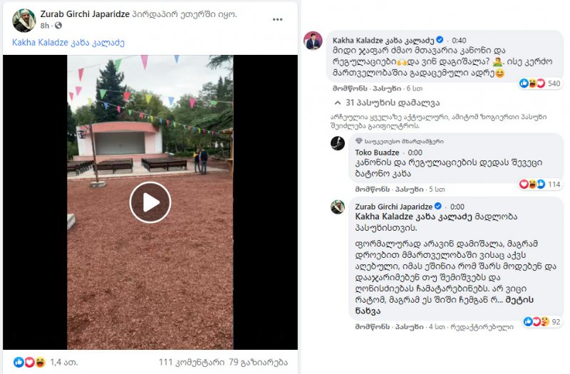 თბილისის მერმა პასუხი ჯაფარიძეს კომენტარის სახით მისივე კედელზე გავრცელებული ვიდეოს ქვეშ დაუტოვა.