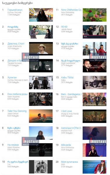 რას უსმენდნენ რუსთაველები და თბილისელები მარტის თვეში. გთავაზობთ TOP 20-ს ვიდეოს საიდანაც 8 არის რუსულენოვანი, 2 არის ინგლისურენოვანი, 1 თურქულენოვანი ხოლო 9 ქართულენოვანია.