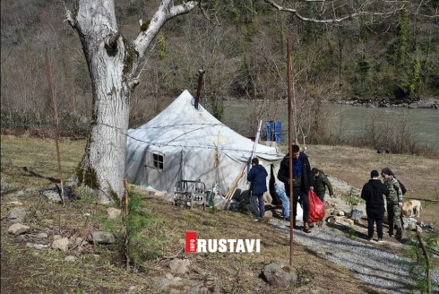 სოფელ ნამოხვანში მდინარე რიონის მიმდებარე ტერიტორიაზე პოლიცია"ნამოხვანჰესის" წინააღმდეგ აქტივისტების მიერ გაშლილ კარვებს შლის.