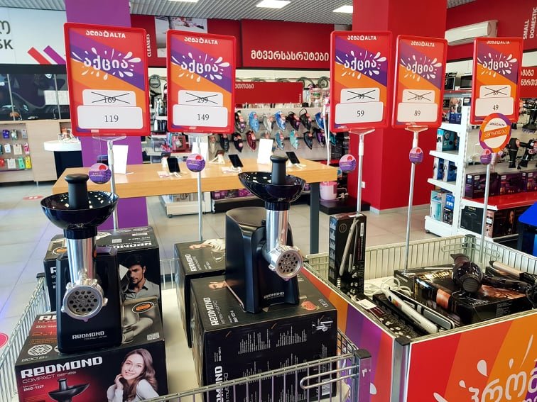 მაღაზიაში ფასდაკლებებია ტექნიკის სრულ ასორტიმენტზე. ასევე, ფილიალში წარმოდგენილია "ამოყიდვის დაფა". გარდა ამისა, ფასდაკლებებთან ერთად, საყოფაცხოვრებო ტექნიკაზე მიიღებთ სასაჩუქრე ბარათებსაც, რომელიც ზოგიერთი ნივთის შემთხვევაში 500 ლარამდე აღწევს.