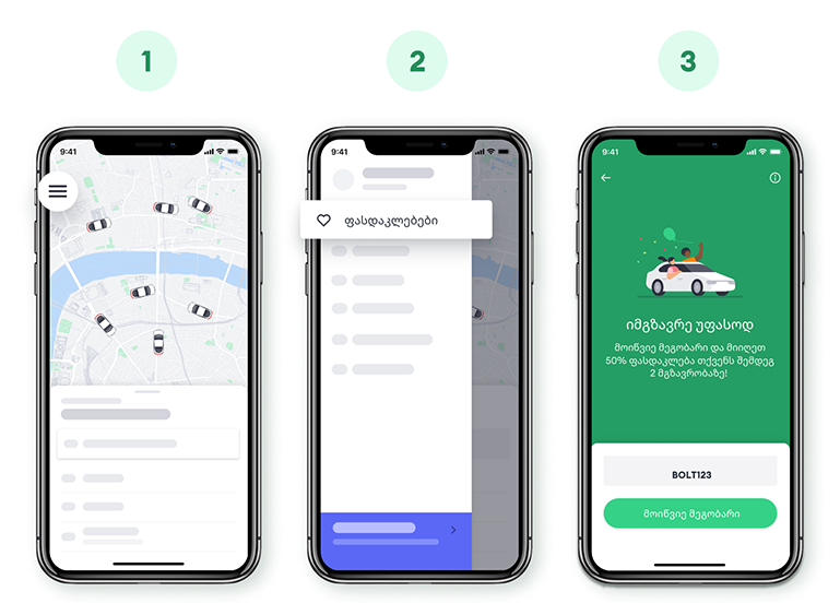 მომსახურებით სარგებლობისათვის აუცილებელია, გადმოწეროთ Bolt მობილური აპლიკაცია და მარტივი რეგისტრაციის შემდეგ, ღილაკზე თითის ერთი დაჭერით, პარტნიორი მძღოლი მოგაკითხავთ სასურველ ადგილზე. ანგარიშსწორებას შეძლებთ როგორც ნაღდი, ასევე უნაღდო გადახდის მეთოდით.