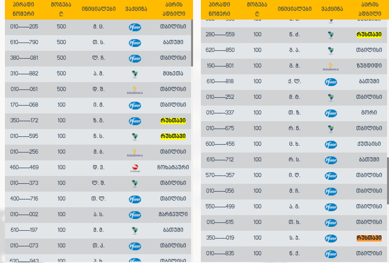 Stopcov.lotto.ge-ზე გამოქვეყნებულ ინფორმაციაში, ვკითხულობთ, რომ გამარჯვებულებს შორის 2 "ფაიზერით",2 კი "სინოვაკის" ვაქცინითაა აცრილი.
