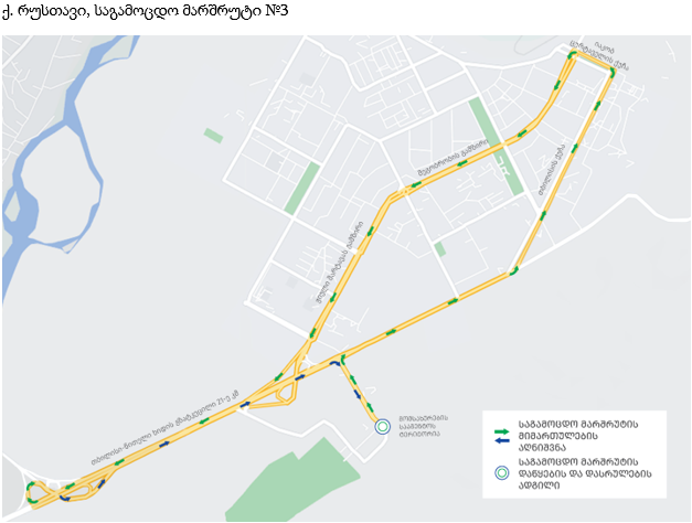 - მესამე მარშრუტი: მომსახურების სააგენტო → თბილისის ქუჩა → იაკობ ცურტაველის ქუჩა → მეგობრობის გამზირი → ჟიული შარტავას გამზირი → თბილისი წითელი ხიდის გზატკეცილი 21-ე კმ → მომსახურების სააგენტო