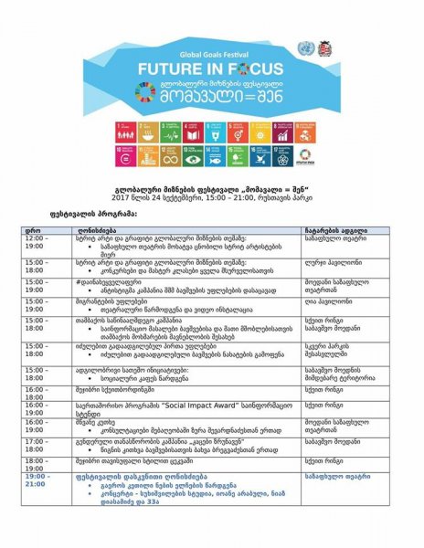 15:00 - 19:00: გაეროს სააგენტოების მიერ ინიცირებული ღონისძიებები, რუსთავის პარკში მდებარე საზაფხულო თეატრის მოხატვა გლობალური მიზნების თემაზე.