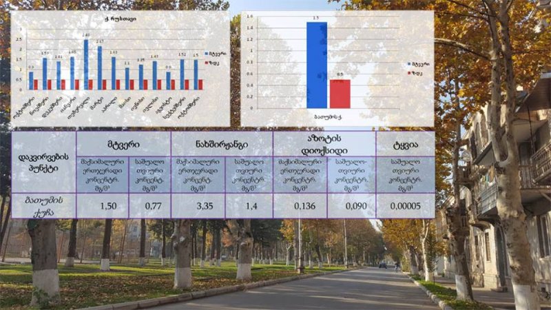 საქართველოში ჰაერის დაბინძურების მაღალი მაჩვენებელის მქონე ქალაქებში რუსთავიც მოხვდა. გარემოს ეროვნული სააგენტო ატმოსფერული ჰაერის დაბინძურების მონიტორინგს ოქტომბრის თვეში ბათუმის ქუჩაზე განთავსებულ სადამკვირვებლო პუნქტზე აწარმოებდა., სადაც ატმოსფერული ჰაერის დამაბინძურებელი ნივთიერებების: მტვრის, ნახშიროჟანგის, აზოტის დიოქსიდის და ტყვიის კონცენტრაციები საზღვრავდა. ჩატარებული მონიტორინგის მიხედვით, რუსთავის ჰაერში მტვრის ერთჯერადი მაქსიმალური კონცენტრაცია 3.0-ჯერ აღემატებოდა ზღვრულად დასაშვებ მნიშვნელობას, ხოლო აზოტის დიოქსიდისა და ნახშირჟანგის ერთჯერადი მაქსიმალური კონცენტრაციები კი ნორმის ფარგლებში იყო. დაბინძურების ყველაზე მაღალი მაჩვენებელი რუსთავის გარდა, თბილისში, ბათუმსა და ქუთაისში ფიქსირდება.