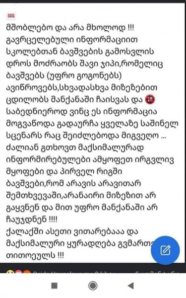 გარდა ამისა, ვრცელდება გამაფრთხილებელი პოსტები სხვადასხვა ანგარიშიდან (account-დან), რომ სკოლებთან შავი ჯიპით მამაკაცი ბავშვების მოტაცებას ცდილობს.