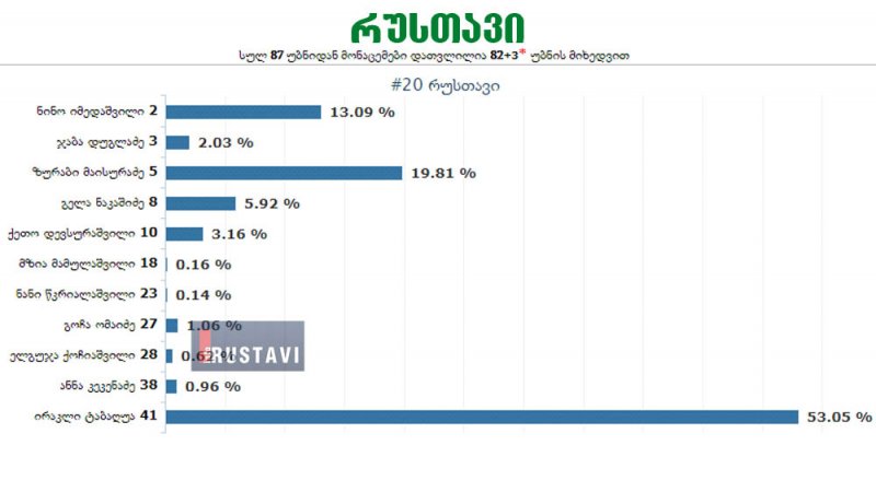 ცესკოს მონაცემებით ამ მომენტისთვის დათვლილია 85 უბანი, მათ შორის არის 3 სპეც უბანი. მერობის 11 კანდიდატზე შემოსული ხმები შემდეგნაირად გადანაწილდა: