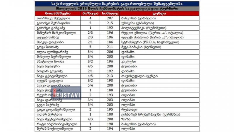 საქართველოს ეროვნულმა ნაკრებმა მსოფლიოს 2019 წლის ჩემპიონატის შესარჩევი ტურნირისთვის მზადება დაიწყო. მთავარმა მწვრთნელმა, ილიას ზუროსმა 24 კანდიდატი დაასახელა, რომელთაგან ნოემბრის საკვალიფიკაციო მატჩებისთვის 12-ს შეარჩევს. ეროვნული ნაკრების გაფართოვებულ შემადგენლობაში სამი რუსთაველი კლათბართული მოხდა. აკაკი დვალიშვილი, ანატოლი ბოისა და გიგი გოგობერიშვილი.