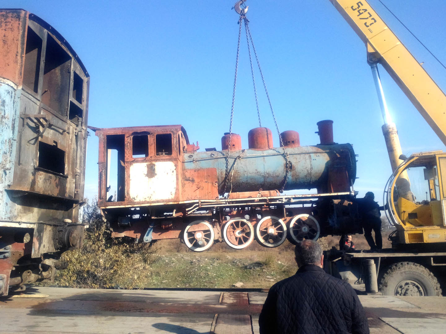 2014 წელს გადაღებულ ამ ფოტოზე ორთქლის ლოკომოტივის რუსთავის საბავშვო რკინიგზის ტერიტორიიდან დემონტაჟია ასახული.