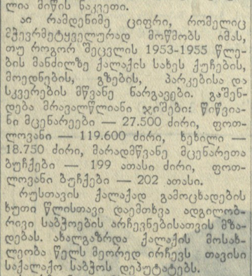 სტატიიდან ირკვევა რომ 1952 წლისთვის ქალაქის კეთილმოწყობის სამუშაოებზე 11 მილიონი მანეთი უნდა დახარჯულიყო, თუმცა 23 მილიონი დაიხარჯა.