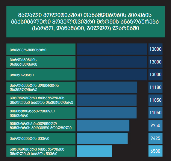 დიაგრამის მიხედვით, შრომის ანაზღაურების ყველაზე მაღალი ოდენობა პრემიერის, პრეზიდენტისა და პარლამენტის თავმჯდომარისთვისაა გათვალისწინებული და ის 13 000 ლარს შეადგენს. მეორე პოზიციაზეა პარლამენტის კომიტეტის თავმჯდომარე 11 800 ლარით, მას კი 11050 ლარით ავტონომიური რესპუბლიკის უმაღლესი საბჭოს თავმჯდომარე მოსდევს.