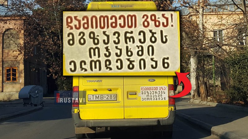 "ინტერტრანსი"-ს მიკროავტობუსს რომელიც მარშრუტს რუსთავი-თბილისის მიმართულებით ასრულებს უკან აწერია "დამითმეთ გზა! მგზავრებს ოჯახში ელოდებიან".