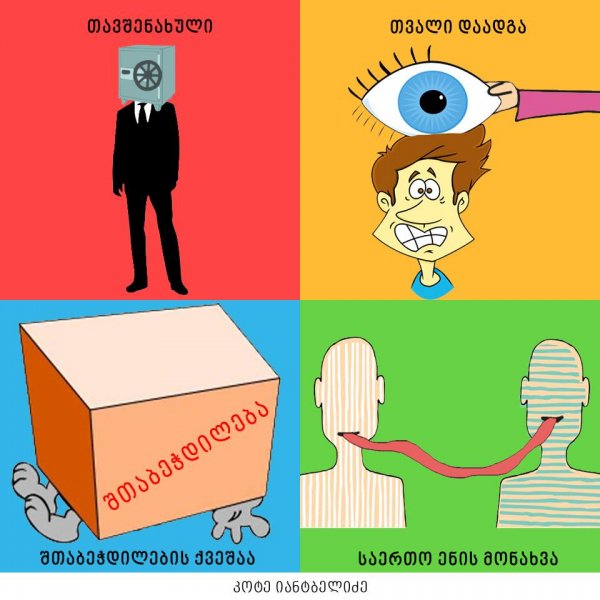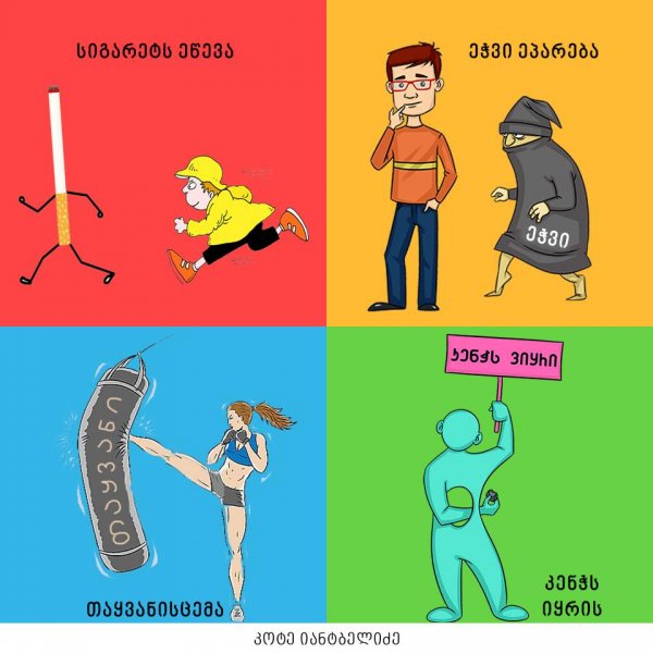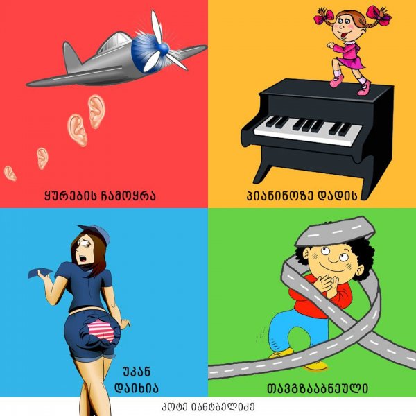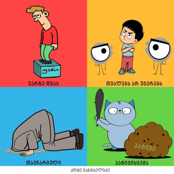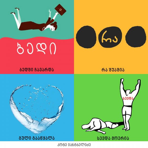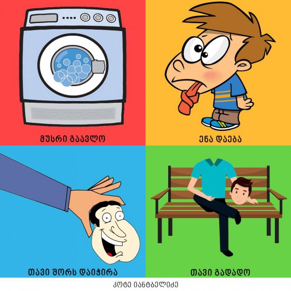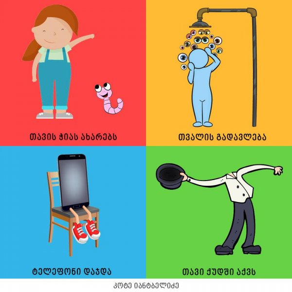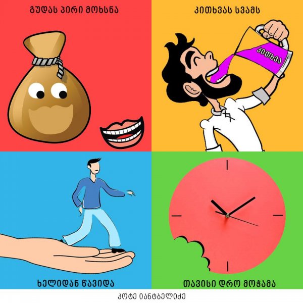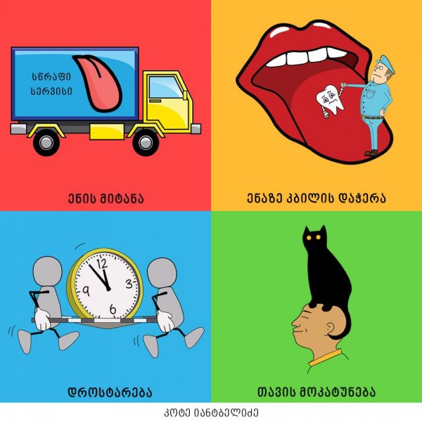 "თავისი დრო მოჭამა", "ყურების ჩამოყრა", "თავის ჭიას ახარებს" - ამ და სხვა ქართული იდიომების კრეატიული ილუსტრაციები კოტე იანტბელიძემ შექმნა.