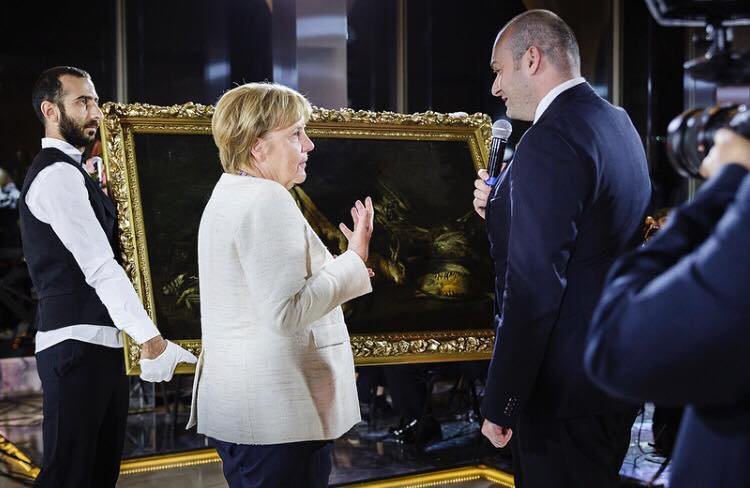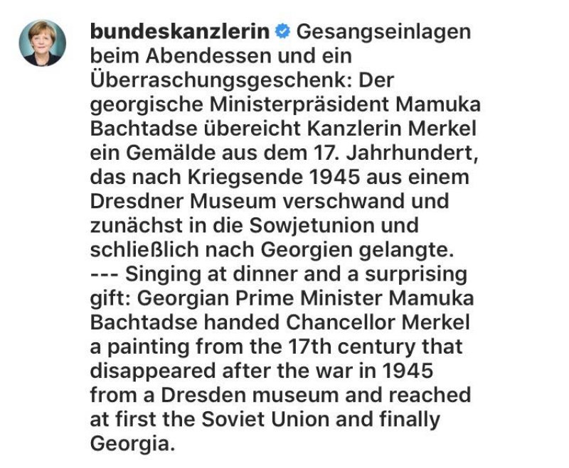 ანგელა მერკელი აღნიშნულს Instagram-ის ოფიციალურ გვერდზე გამოეხმაურა: "ვახშამის დროს სიმღერა და შესანიშნავი საჩუქარი: საქართველოს პრემიერ-მინისტრმა მამუკა ბახტაძემ გერმანიის კანცლერს მე-17 საუკუნის ნახატი გადასცა, რომელიც 1945 წელს ომის დროს დრეზდენის მუზეუმიდან გაქრა, მერე იყო საბჭოთა კავშირში, შემდგომ კი საქართველოში აღმოჩნდა".