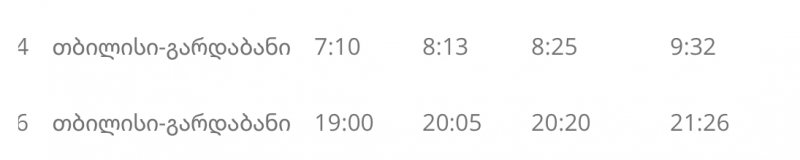 გამოსვლა გარდაბნიდან- 8:25, ჩამოსვლა თბილისში - 9:32